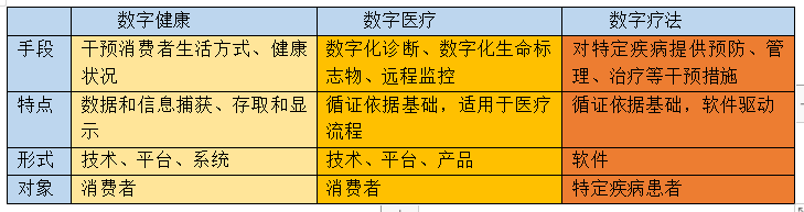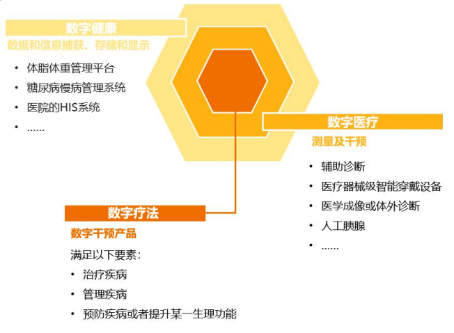 數(shù)字健康包括干預(yù)消費(fèi)者生活方式、健康狀況和其他與健康相關(guān)的技術(shù)、平臺(tái)和系統(tǒng);相較于數(shù)字健康,數(shù)字醫(yī)療是具有循證依據(jù)基礎(chǔ)的,適用于醫(yī)療流程的技術(shù)、平臺(tái)或者產(chǎn)品,包括數(shù)字化診斷、數(shù)字化生命標(biāo)志物、遠(yuǎn)程監(jiān)控等產(chǎn)品。而數(shù)字療法相較于數(shù)字醫(yī)療,核心功能是由軟件驅(qū)動(dòng)的,服務(wù)對(duì)象更強(qiáng)調(diào)著眼于患者,是對(duì)患者特定疾病提供的預(yù)防、管理、治療等干預(yù)措施。